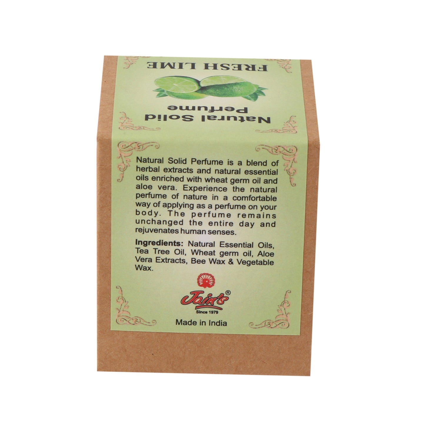 NATURAL SOLID PERFUME IS A BLEND OF HERBAL EXTRACTS AND NATURAL ESSENTIAL OIL ENRICHED WITH WHETA GEORM OIL AND ALOEVERA .